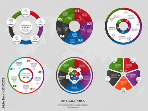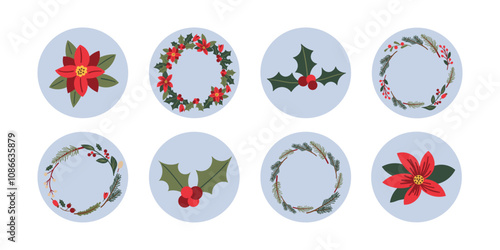 Merry Christmas card set, vector illustration in paper art modern craft style. Winter holidays composition in circle with Christmas trees, stockings, angels, reindeer, gift box, holly berries.