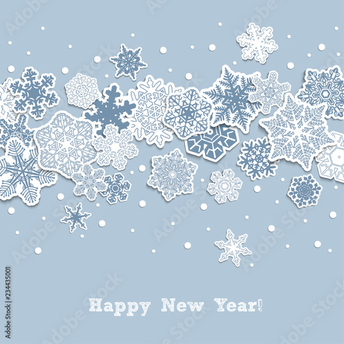Merry Christmas Happy New Year vector poster design template. Decorative round frame with paper cut snowflakes and copy space.