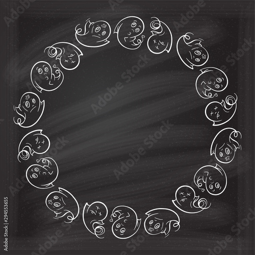 Merry Christmas round border on chalkboard vector illustration. Happy holiday background with sweet pastry treats and hot drinks art design. Festive graphic sketch in grunge style