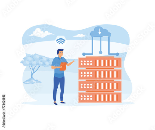 Merry Christmas scene. City Christmas tree with ice rink, flat vector illustration. Young man ice skating. Happy New Year. Winter holidays celebration.
