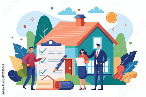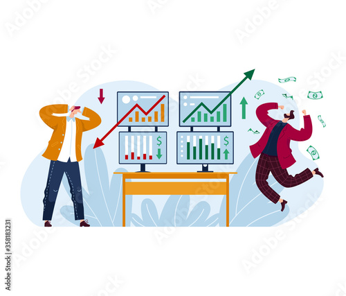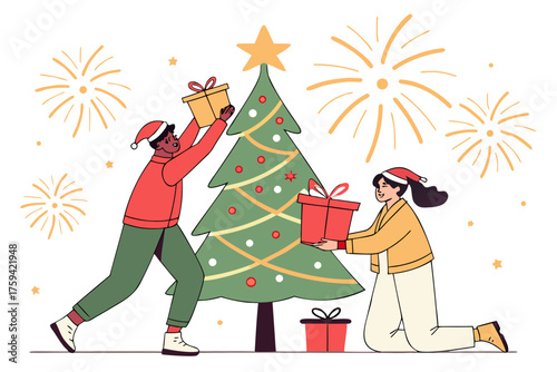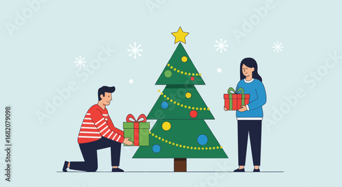 Merry Christmas scene. Happy couple decorating Christmas tree with toys and garland, flat vector illustration. Happy New Year. Winter holidays celebration.