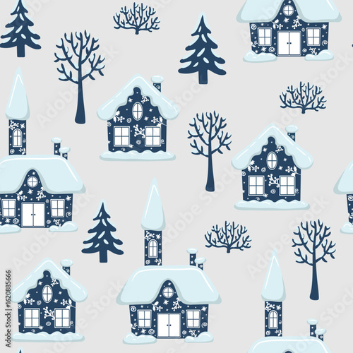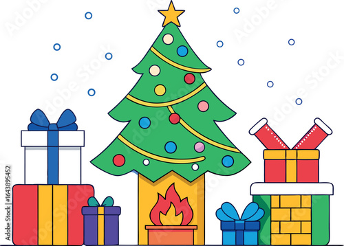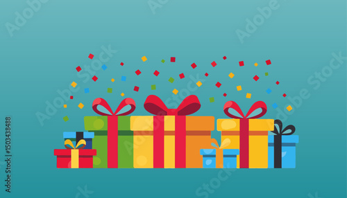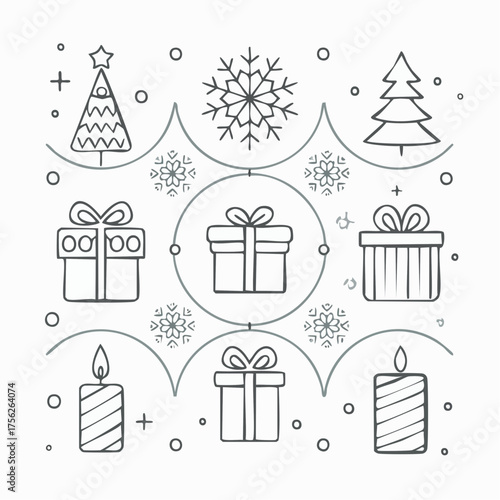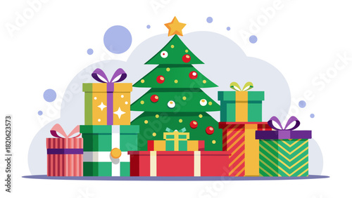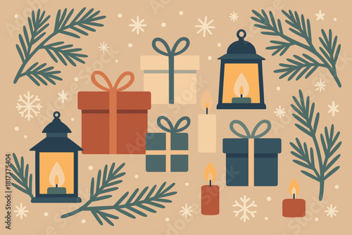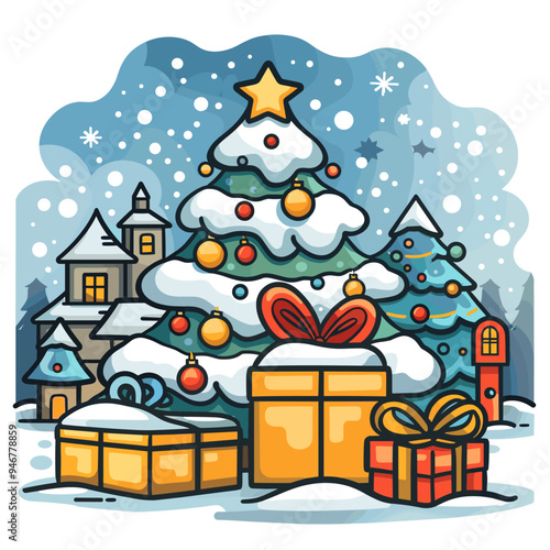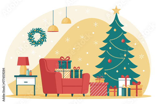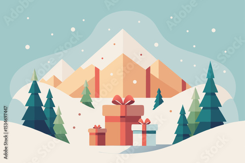 Merry Christmas scene, vector illustration. Gift box with ribbon and bow on display podium, paper cut winter background with deer silhouette.