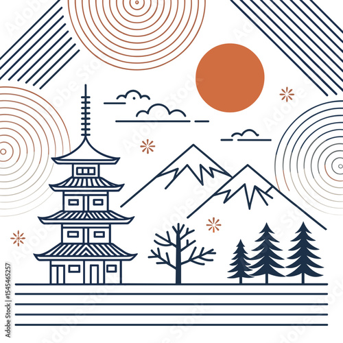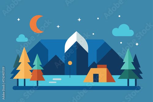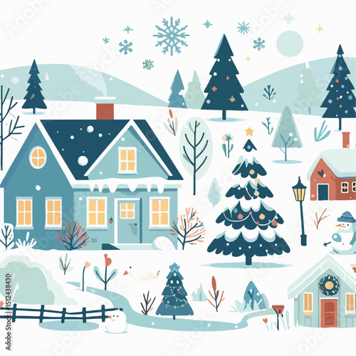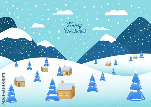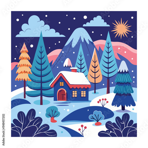 Merry Christmas scene, vector illustration in paper art style. Decorated Christmas tree with balls, lantern, winter night forest landscape.