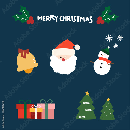 Merry Christmas vector flat style design illustration. Santa hat, gift boxes, snowman, snowflake, christmas tree and big red heart. Winter holidays composition for web banner, website page etc.