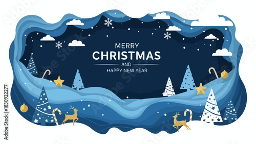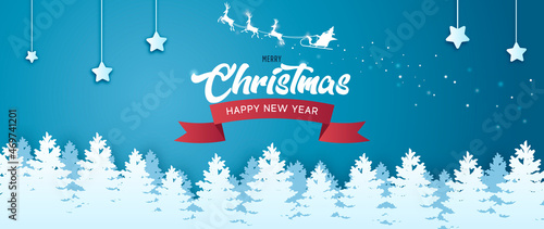 Merry Christmas vector website template, web page and landing page design for website and mobile site development. Paper cut Santa riding sleigh with reindeer, winter night landscape.