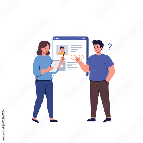 Vector illustration of security guard female scanning passenger male with metal detector. Airport people flat style design element, icon isolated on white background.