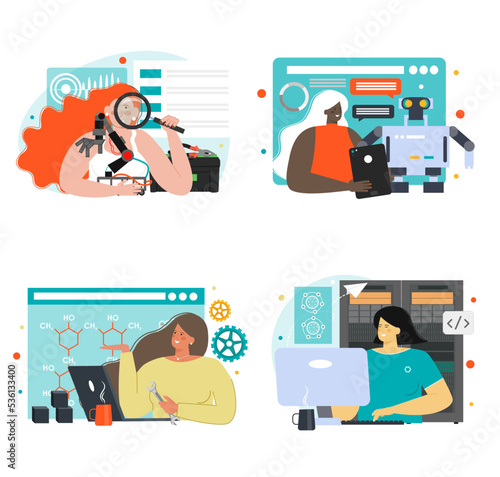 Metaverse concept. People isolated scene vector set. Men and women in VR headset using cyberspace for work, playing game, study and science illustration