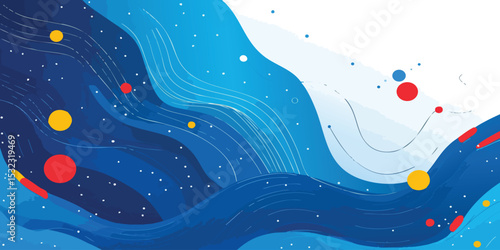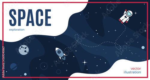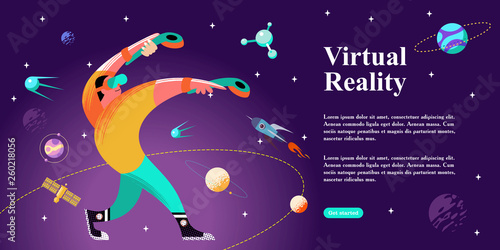 Metaverse or virtual world. Young boy wearing VR glasses interacting with virtual reality, flat vector illustration. VR technology, metaverse gaming poster, banner template.
