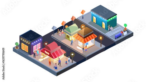 Metro station, flat vector illustration. Isometric city street cross section with subway entrance, train, tunnel, railway platform, escalator, entrance gate, ticket machine, information stand.