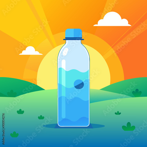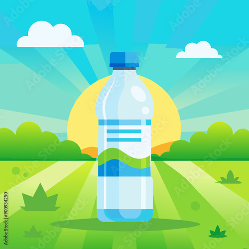 Milk packaging plastic bottle mockup on display podium, paper cut fields, cows, milk splashes, vector illustration. Natural healthy dairy food product ads template.