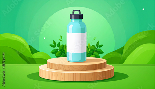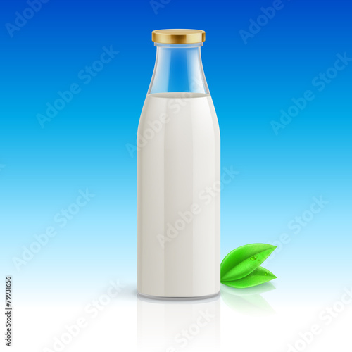 Milk packaging plastic bottle mockup on display podium, paper cut fields, cows, milk splashes, vector illustration. Natural healthy dairy food product ads template.