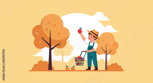Milkmaid milking a cow, sitting on a stool under a fruit tree, metal bucket near. Cattle breeding, farming. Vector illustration in flat design
