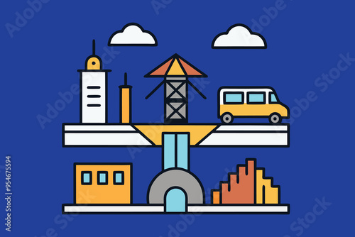 Coal mining industry vector illustration. Fossil fuel soil pile transportation on trolley cart wagon through railway. Charcoal extraction in mine. Black mineral resource industrial manufacturing
