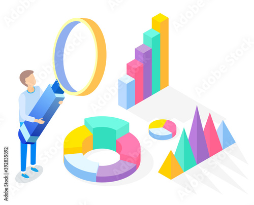Mobile analytics concept flat vector illustration. Isometric smartphone with color pie chart and bar graph on screen. Users interaction with mobile sites and applications.