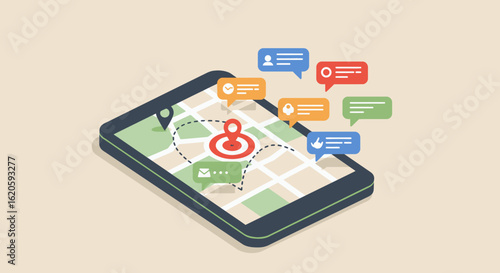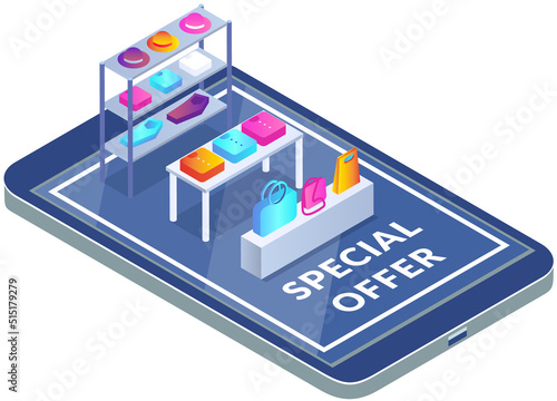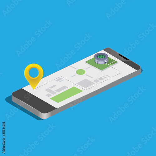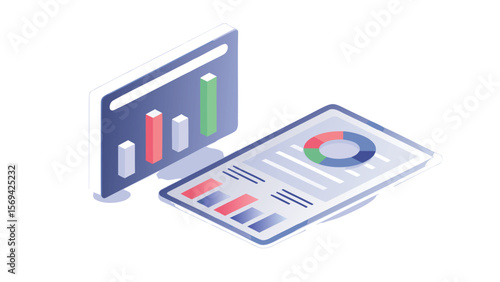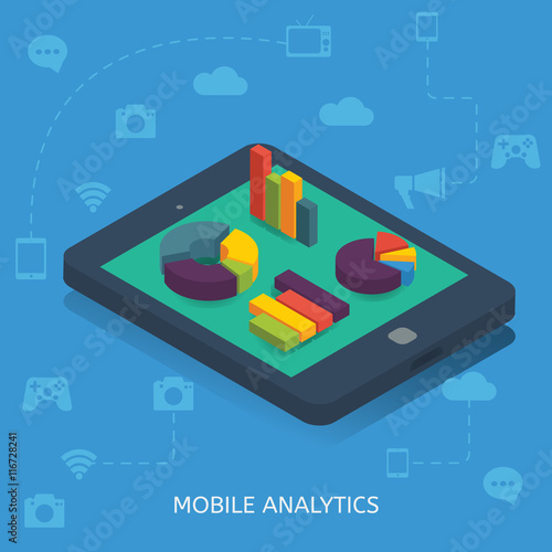 Mobile analytics concept vector flat isometric illustration. Smartphone with charts on screen. Process of monitoring and collecting the data that take place on mobile websites.