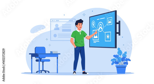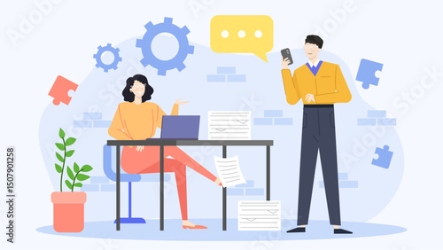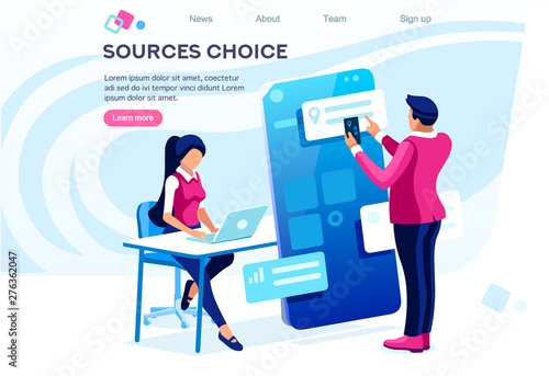 Mobile app development services, vector flat style design illustration. Tiny people software application developers building big smartphone user interface.