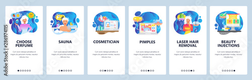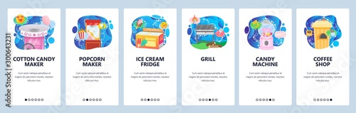 Mobile app onboarding screens. Female developer, programming code, admin panel and java script. Menu vector banner template for website and mobile development. Web site design flat illustration.