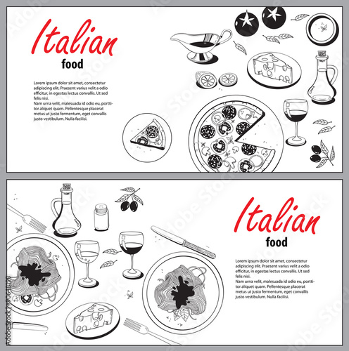 Mobile app onboarding screens. Italian food cooking, italy cuisine, lasagne, macaroni, gelato, focaccia. Menu vector banner template for website and mobile development. Web site design flat illustration.