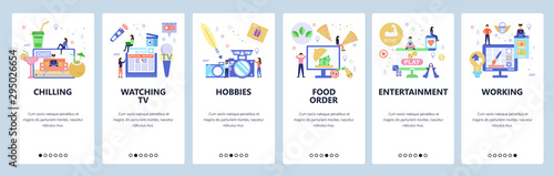 Mobile app onboarding screens. Video marketing, promotion, direct mail, keywords. Menu vector banner template for website and mobile development. Web site design flat illustration.