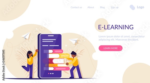 Vector illustration of big mobile phone with statistical dashboard on screen, light bulb and people shouting through megaphone, texting messages. Using mobile website, mobile app for business concept.