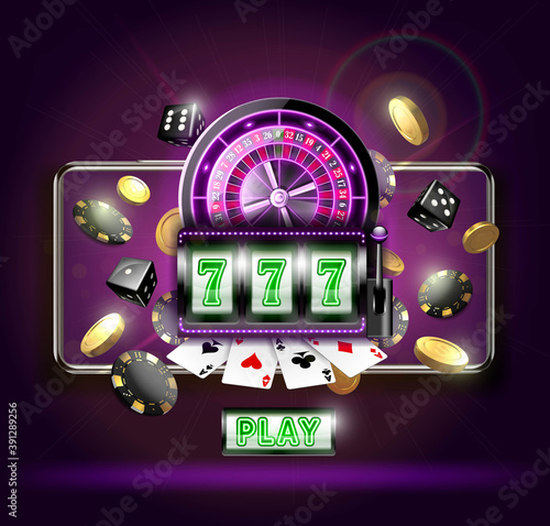 Mobile casino vector poster banner design template. Smartphone, roulette wheel, playing cards, slot game, poker chips, dice, golden dollar coins and trophy cup. Online casino concept.