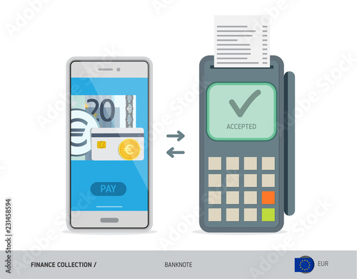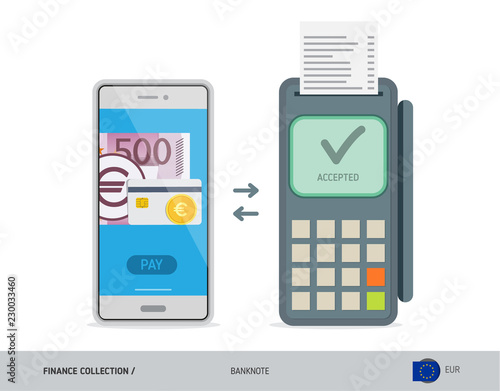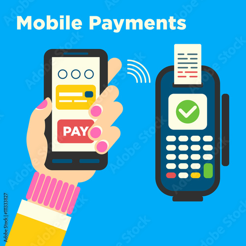 Mobile payments with smartphone. Near field communication payment terminal concept. Online transactions, paypass and NFC. Cartoon flat style vector illustration.