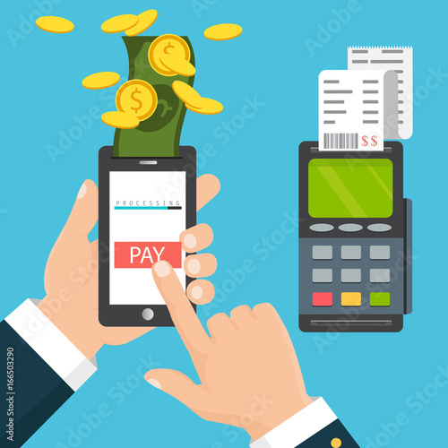 Mobile payments with smartphone. Near field communication payment terminal concept. Online transactions, paypass and NFC. Cartoon flat style vector illustration.