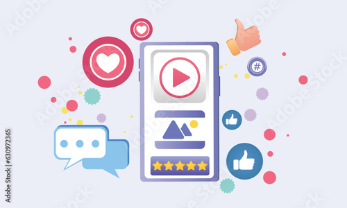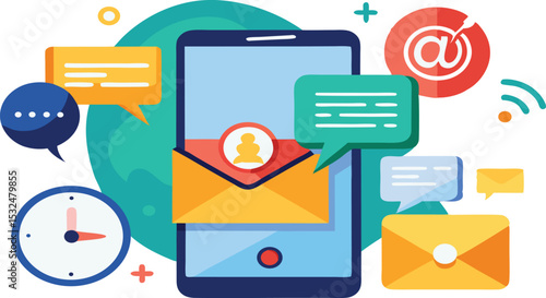 Mobile phone with speech bubble, charts, star rating, email, wifi signs, flat vector illustration. Multimedia communication device used for calling, messaging, chatting on social networks etc.