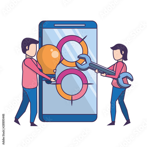 Mobile phone repair service, vector flat style design illustration. Tiny people professional technicians repairing shattered screen of big smartphone. Cell phone fix and maintenance service concept.