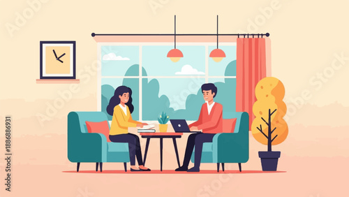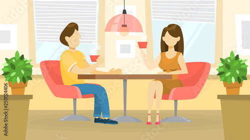 Vector illustration of young man and woman sitting at the table in cafe and making use of smart phone or cell phone. Modern gadgets concept design element in flat style.