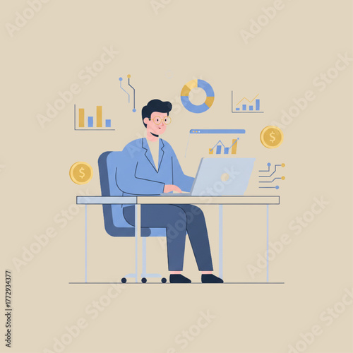 Vector illustration of office man, businessman working at the computer. Modern gadgets in business concept design element in flat style.