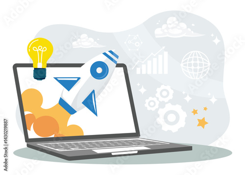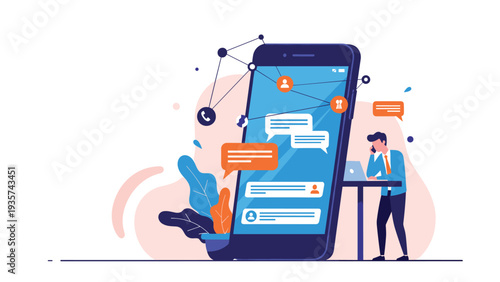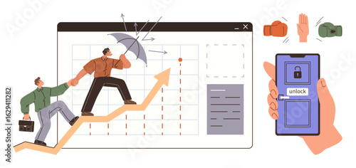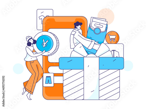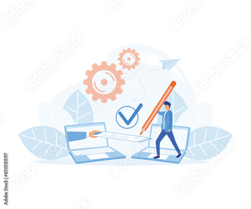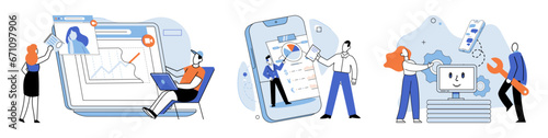 Vector illustration of tiny characters using huge tablet, earphones and smartphone. Modern gadgets, mobile digital devices concept for web banner, website page etc.