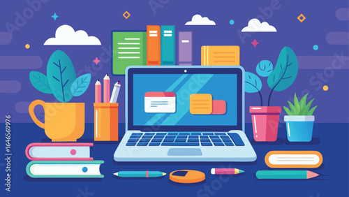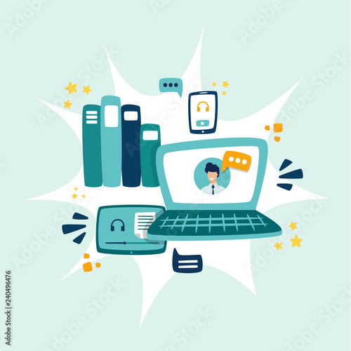 Modern gadgets vector flat illustration. Laptop, mobile phone, headphones, music player, smart watch. Fashionable electronic devices and new wearable technology poster, banner.