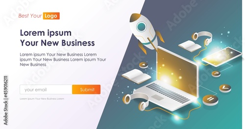 Modern gadgets vector flat illustration. Laptop, mobile phone, tablet, smartwatch and hand holding dollar coin. Electronic devices, wearable technology, investment in modern technology poster, banner.