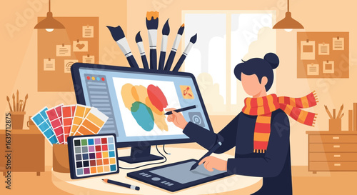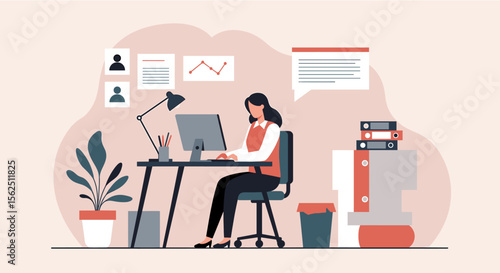 Modern office workplace with vision board. Happy girl working on laptop computer sitting at desk, flat vector illustration. Business workplace. Goal and dream visualization.