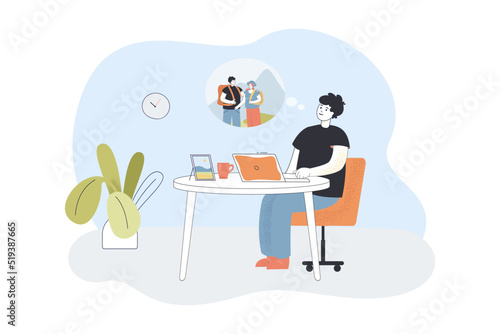 Modern office workspace. Happy girl working at office desk while sitting on bright pink color ottoman, flat vector illustration. Business workplace comfortable seating solution.