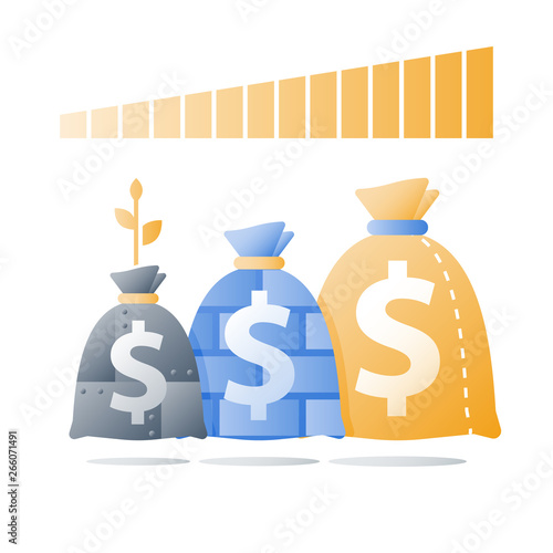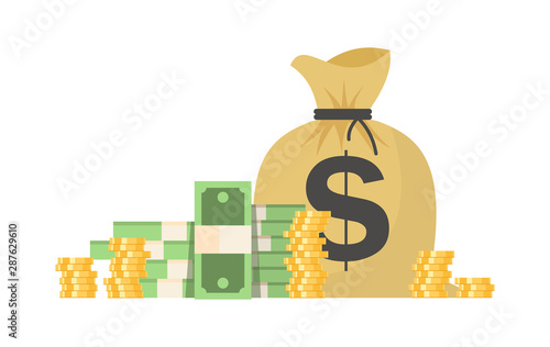 Money bag and dollar cash coin stack icon. Vector finance sack isolated on white background. Moneybag with treasure jackpot