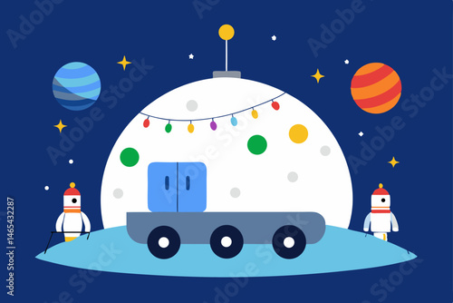 Vector illustration of astronauts walking on the Moon surface with aliens, working at lunar roving vehicle, space base and space exploration equipment. Flat style design.