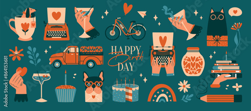 Morning coffee in cafe concept vector poster. People at a table in a restaurant drink tea. Friends meeting for breakfast. People drink hot tea. Table with tea pot and cups.