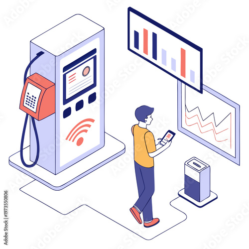 Mother and little son child ordering food and drink using interactive food pos terminal machine cartoon vector illustration. Modern technology, electronic kiosk selling fastfood