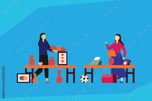 Mother boss with laptop in one hand and baby bottle in the other, flat vector illustration. Business woman taking care of baby and working from home. Work life balance.
