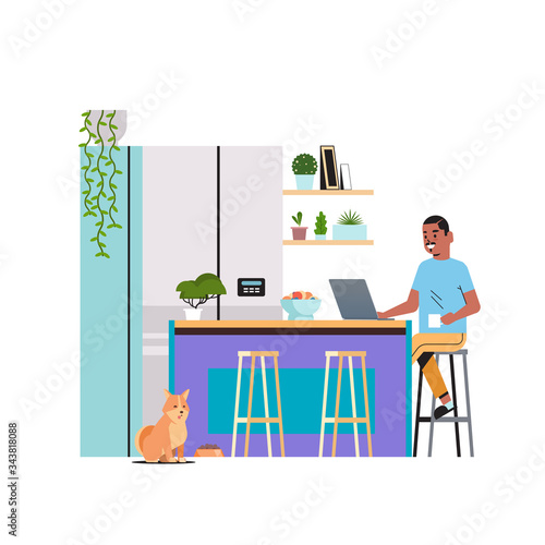 Mother cooking and babysitting her kid. Kitchen interior vector illustration in flat style.