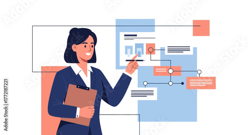Vector illustration of woman standing next to stove in kitchen. Mother flat style design element.