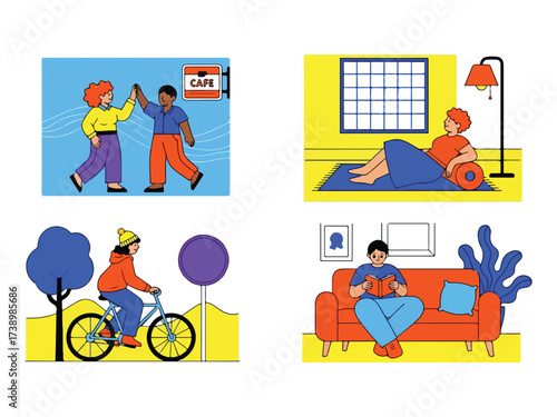 Moto driving school vector scene. Student study on lesson, learn rules traffic regulations, pass exam. Motorcyclist getting license. Isolated flat set
