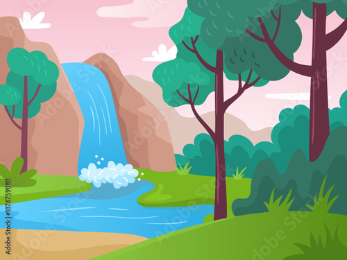 Mountain forest cartoon nature vector background. Green grasslands meadow with trees and bushes. Beautiful landscape illustration