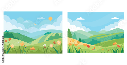 Mountain lake view vector illustration. Beautiful nature background. Summer landscape. Picturesque valley panorama with river in grassland