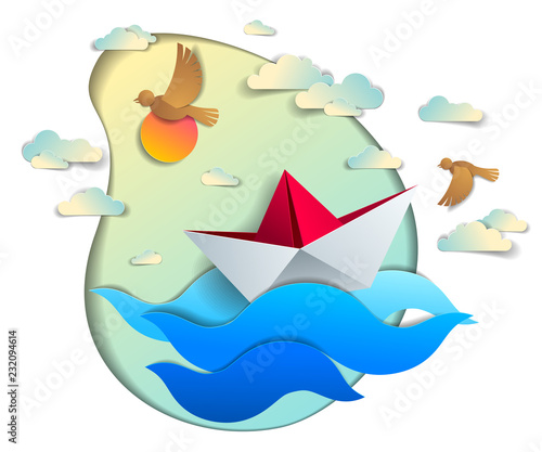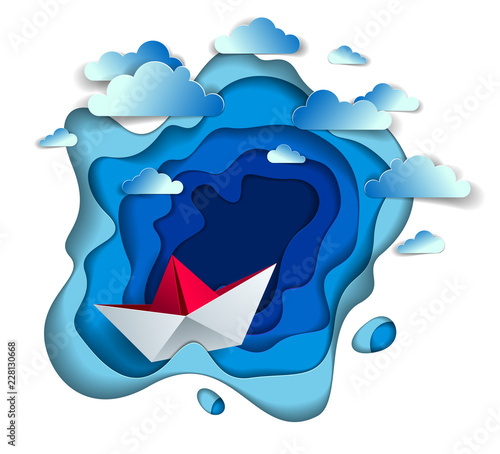 Mountains papercut background 3d nature vector. Art style forest landscape illustration in craft style. Layered origami spring or summer design with grass, sun and cloud. Travel, tourism and adventure