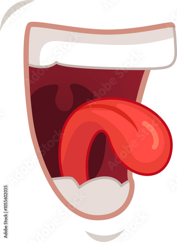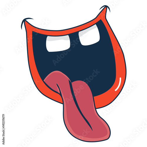 Slobber mouth with tongue, slime and teeth vector. Comic zombie monster slobbering lips isolated on white background. Tasty feeling emotion illustration. Halloween mask