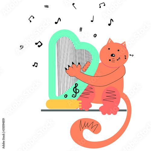 Music cat playing harp vector. Cartoon funny pet animal character musician icon. Kitten giving musical performance isolated on white background