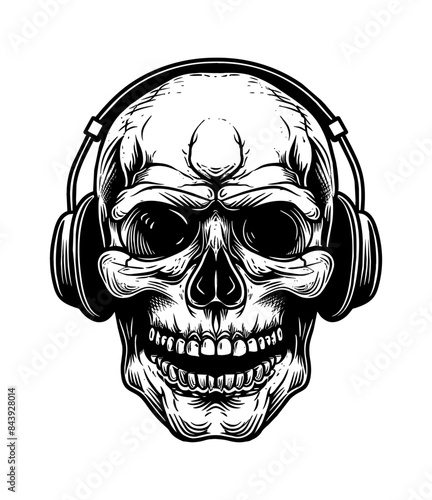 Monkey with headphones t-shirt vector grunge illustration. Chimpanzee having fun while listening to music.